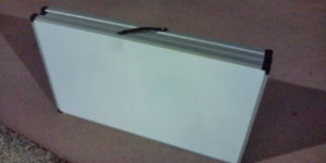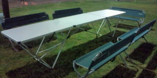 真っ白の天板にV字型の脚を配した3mの長テーブル(折り畳んで便利!)+背もたれ付きのイス♪
